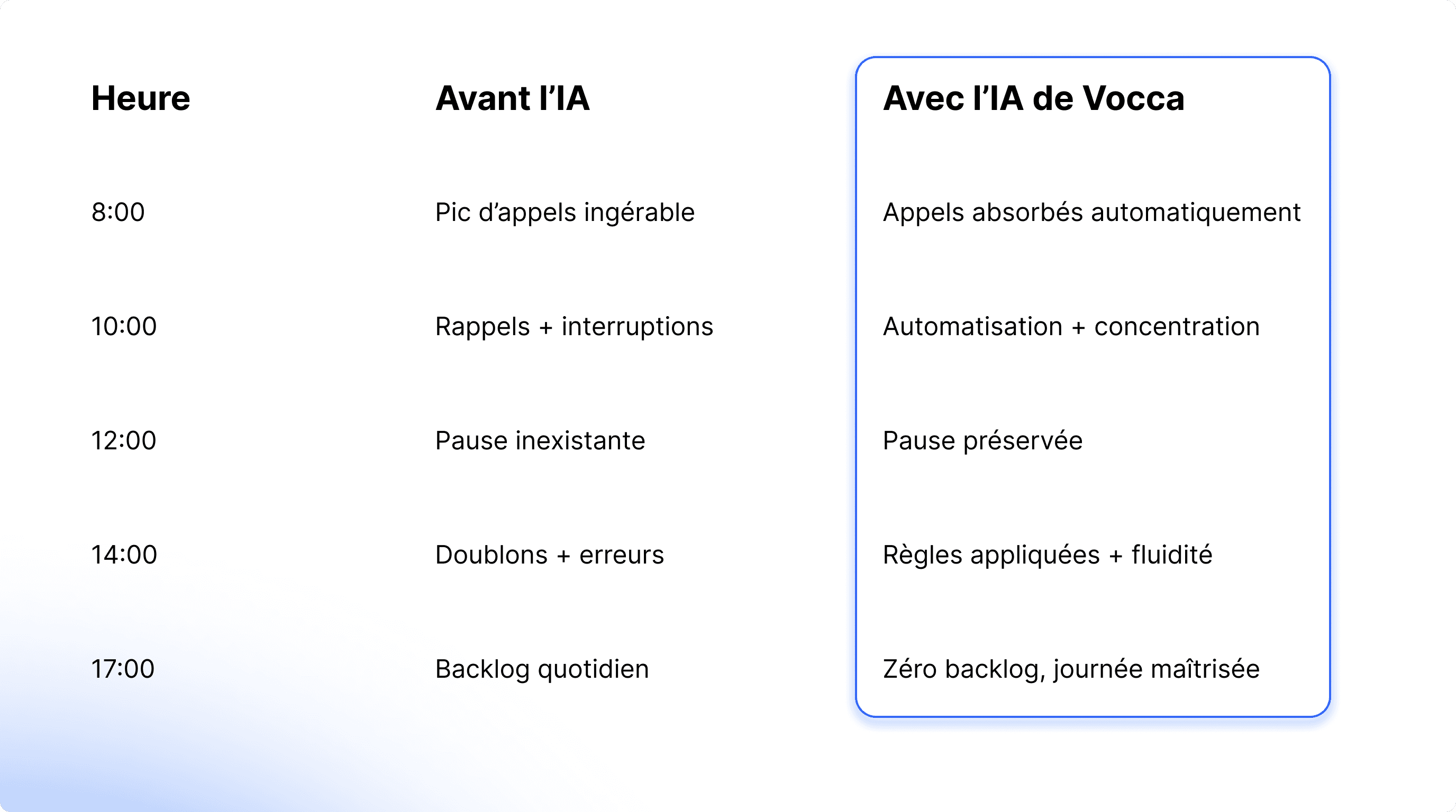 👉 Prenez rendez-vous avec un expert pour découvrir comment le télésecrétariat médical IA de Vocca peut réduire votre surcharge d’appels et améliorer l’organisation de votre centre.